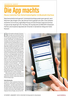 Maschinensicherheit leicht gemacht: Sicherheitslichtvorhänge werden gerne genutzt, wenn Maschinen oder Anlagen sicher, aber dennoch leicht zugänglich sein sollen. Einen einfachen Assistenten für Einrichtung, regelmäßige Prüfung und Dokumentation zeigte die Schmersal Gruppe auf der diesjährigen SPS in Nürnberg: Die neue Baureihe SLC440/COM mit BluetoothInterface und Smartphone-App bietet dem Anwender im betrieblichen Alltag einen hohen Nutzwert.